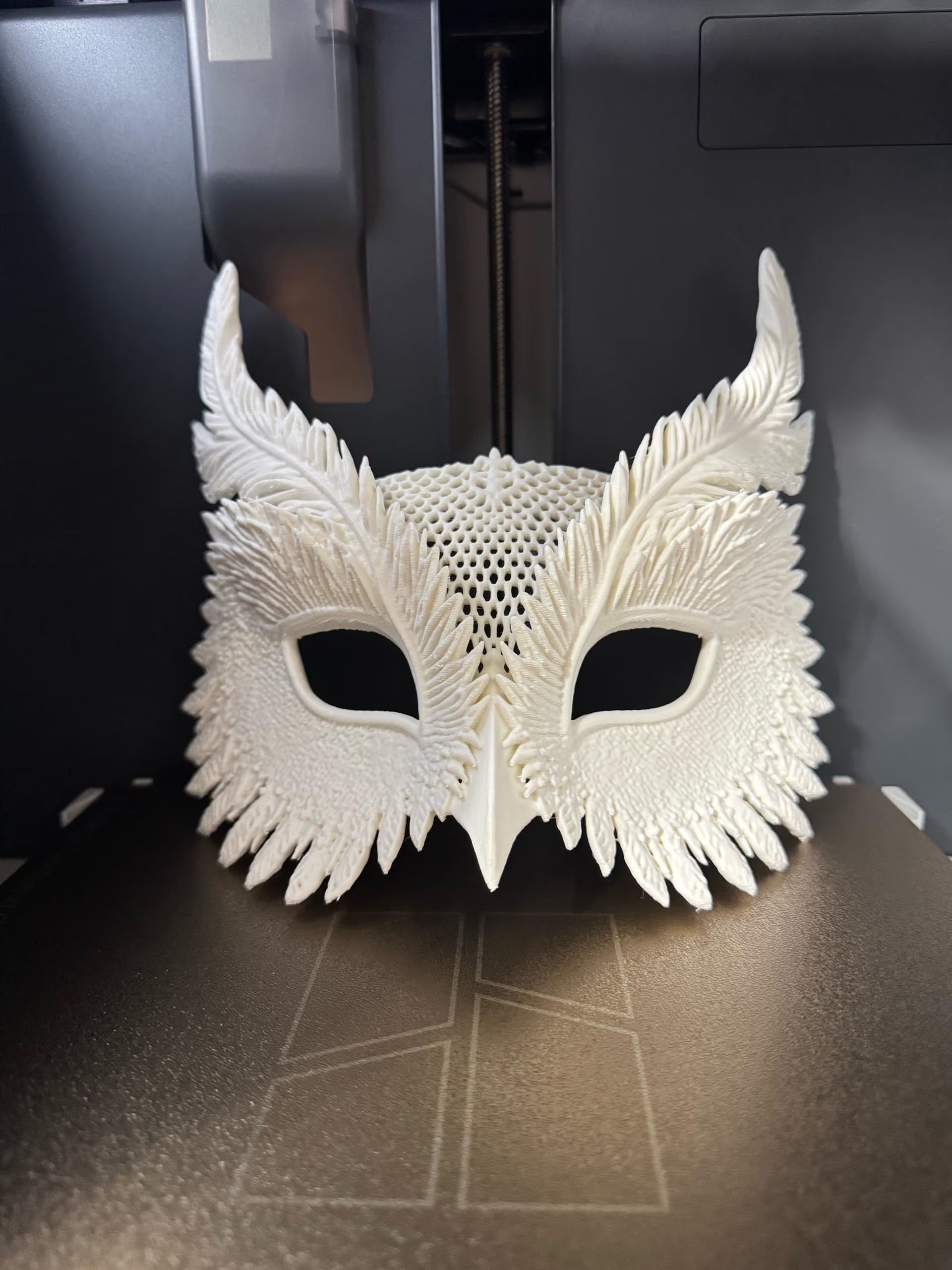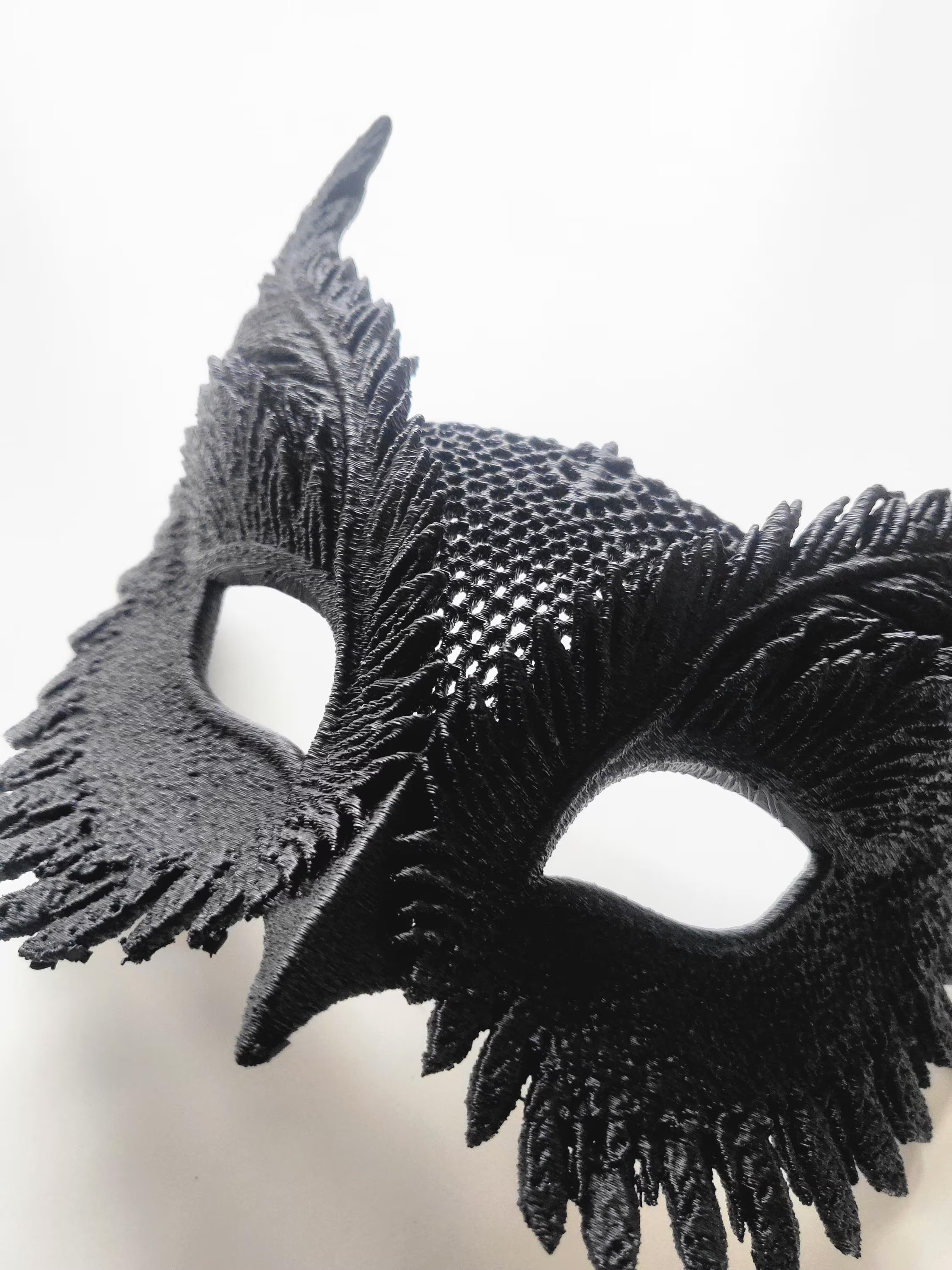 …crafted with intricate detail, this design captures the fierce yet beautiful essence of a winged hunter. The mask features striking feather plumes rising above the eyes and a dramatic, layered fringe along the bottom.