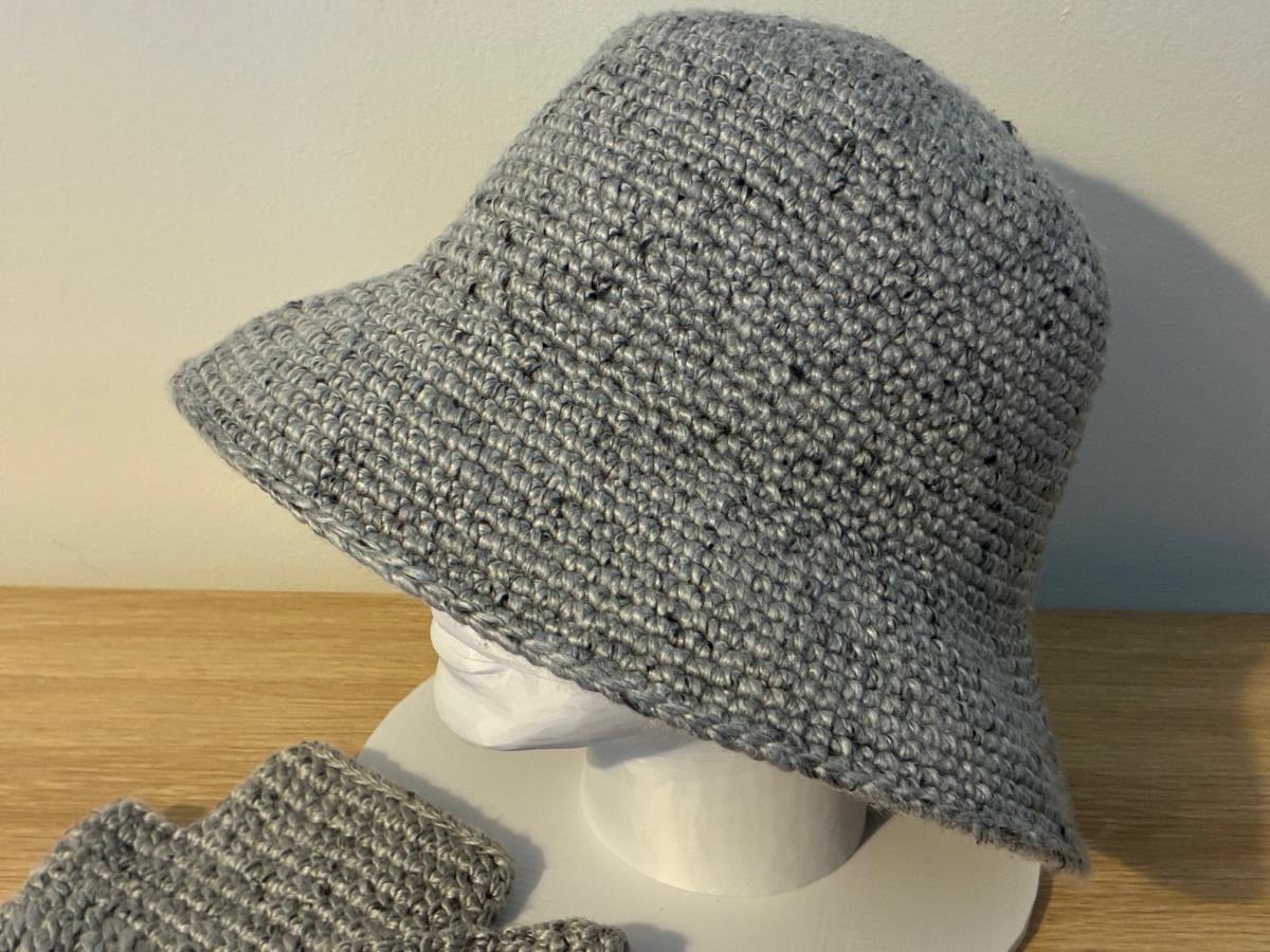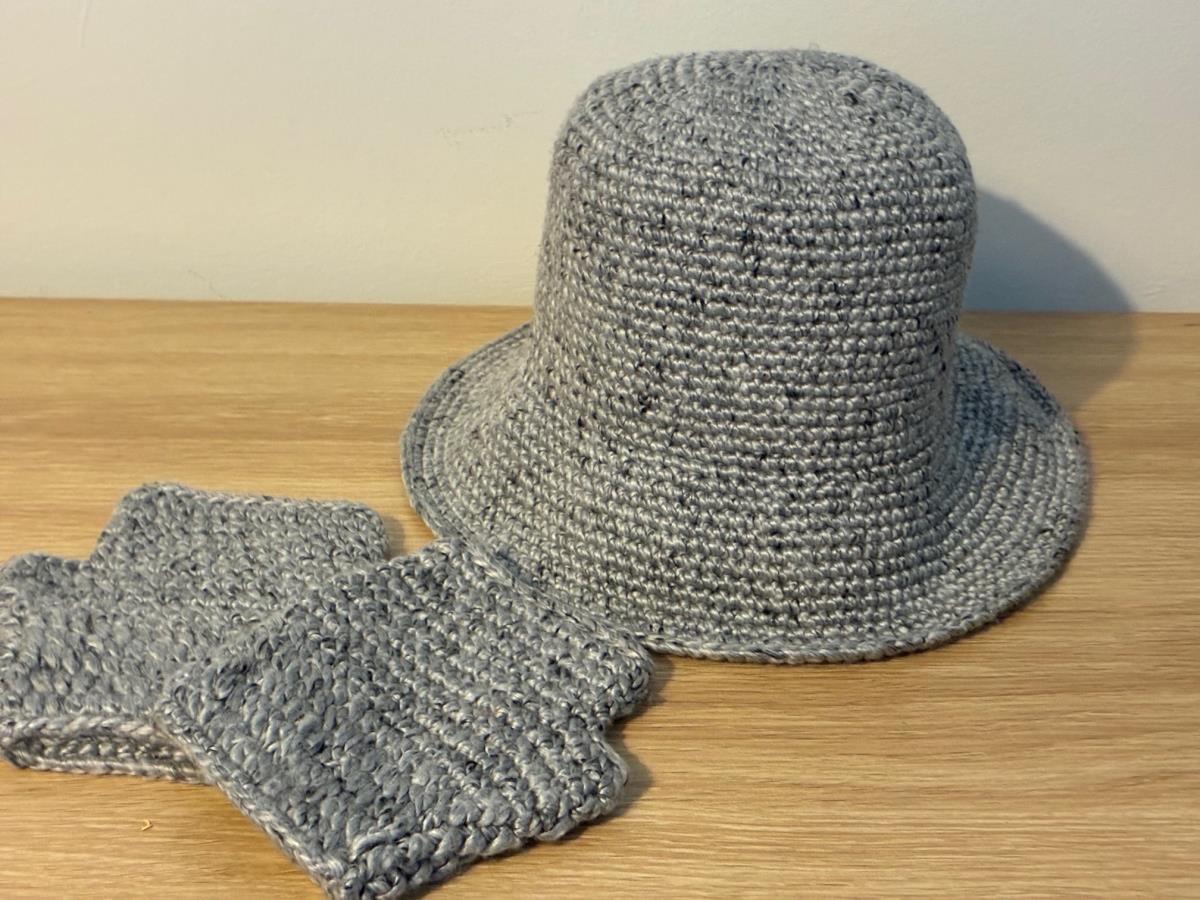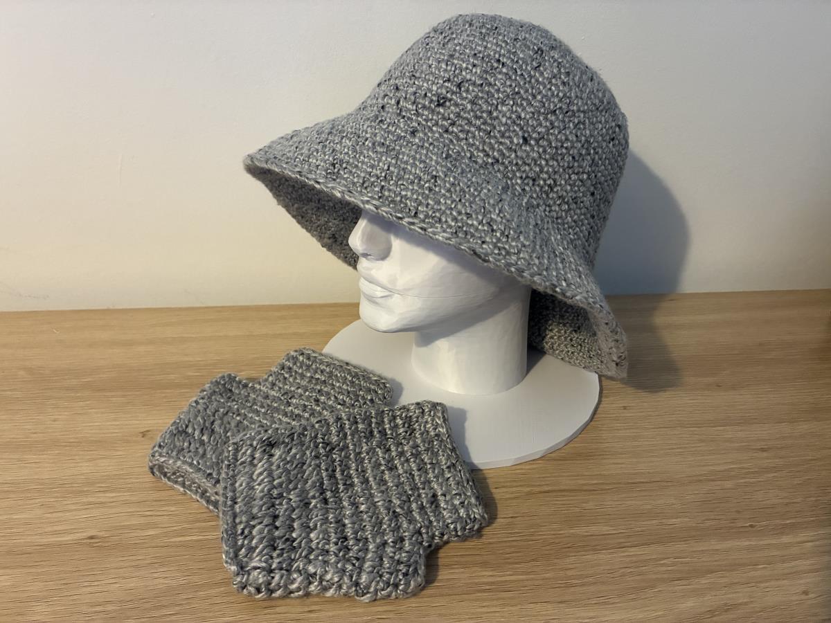 This matching set includes a grey knitted bucket hat and fingerless gloves, carefully handcrafted to provide comfort, warmth, and a timeless winter look.