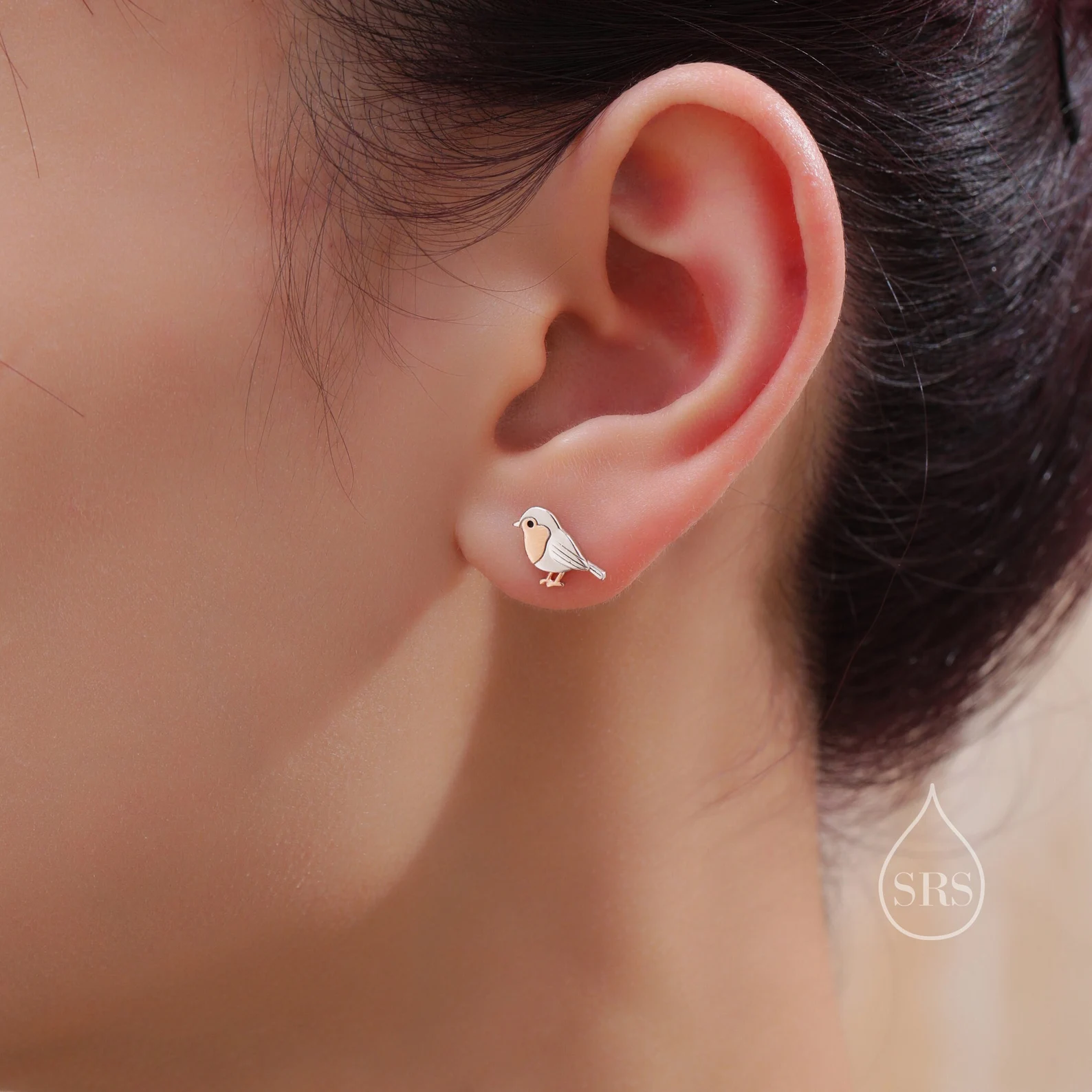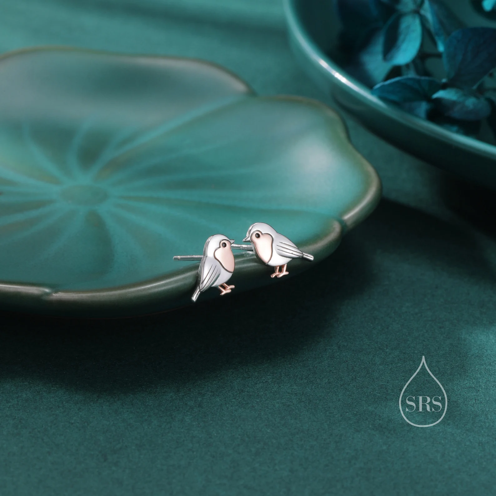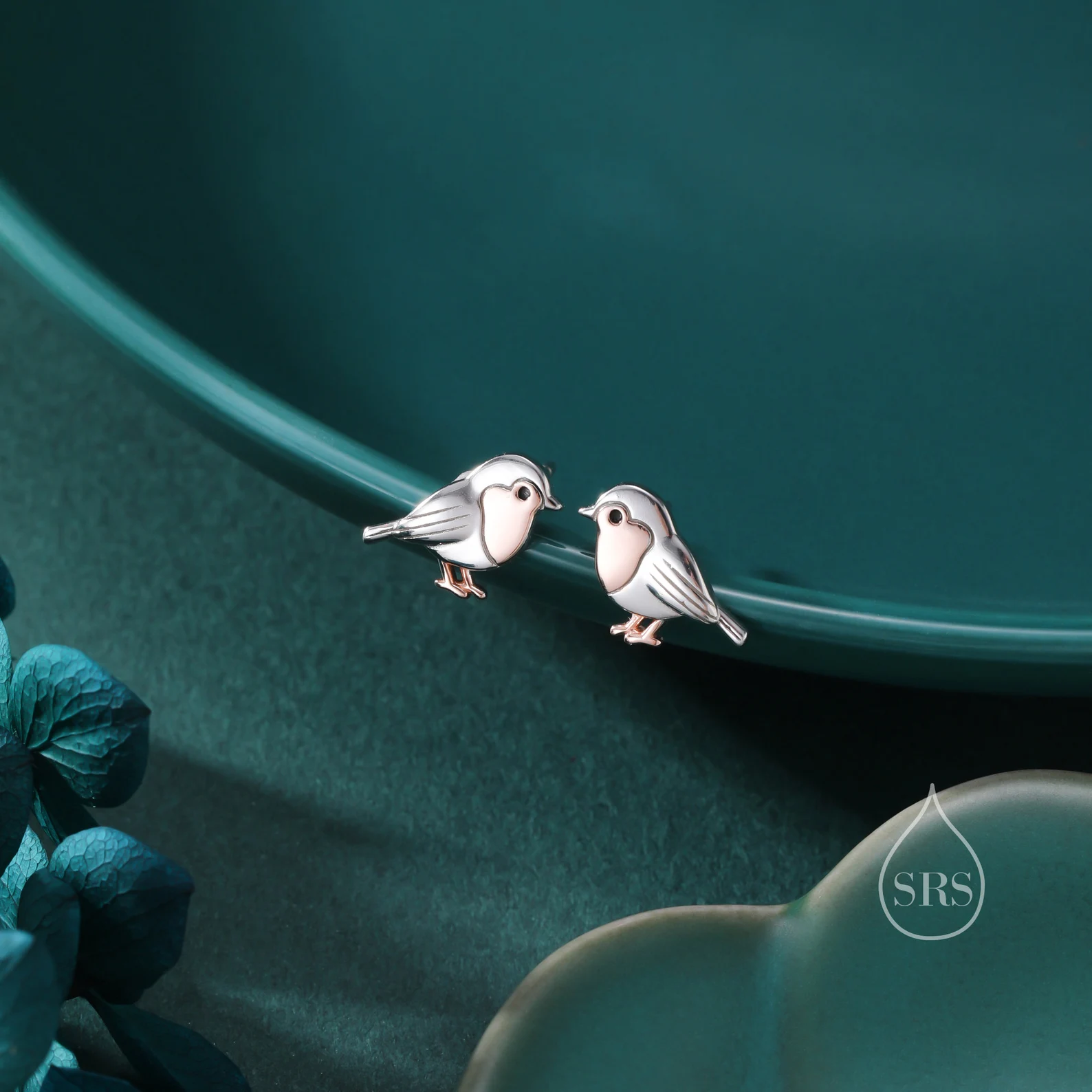 Baby Robin Bird Stud Earrings in Sterling Silver, Partial Rose Gold Coating, British Bird Earrings, Nature Inspired Animal Earrings