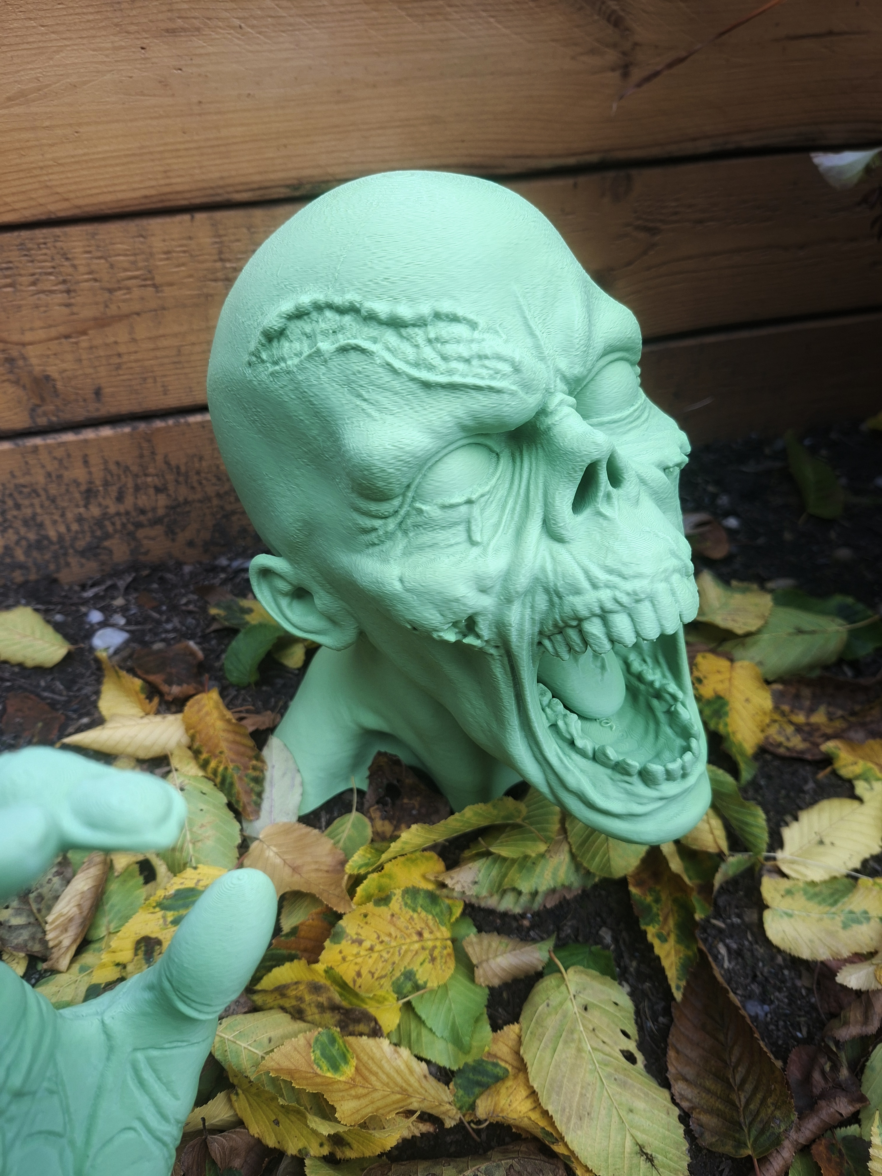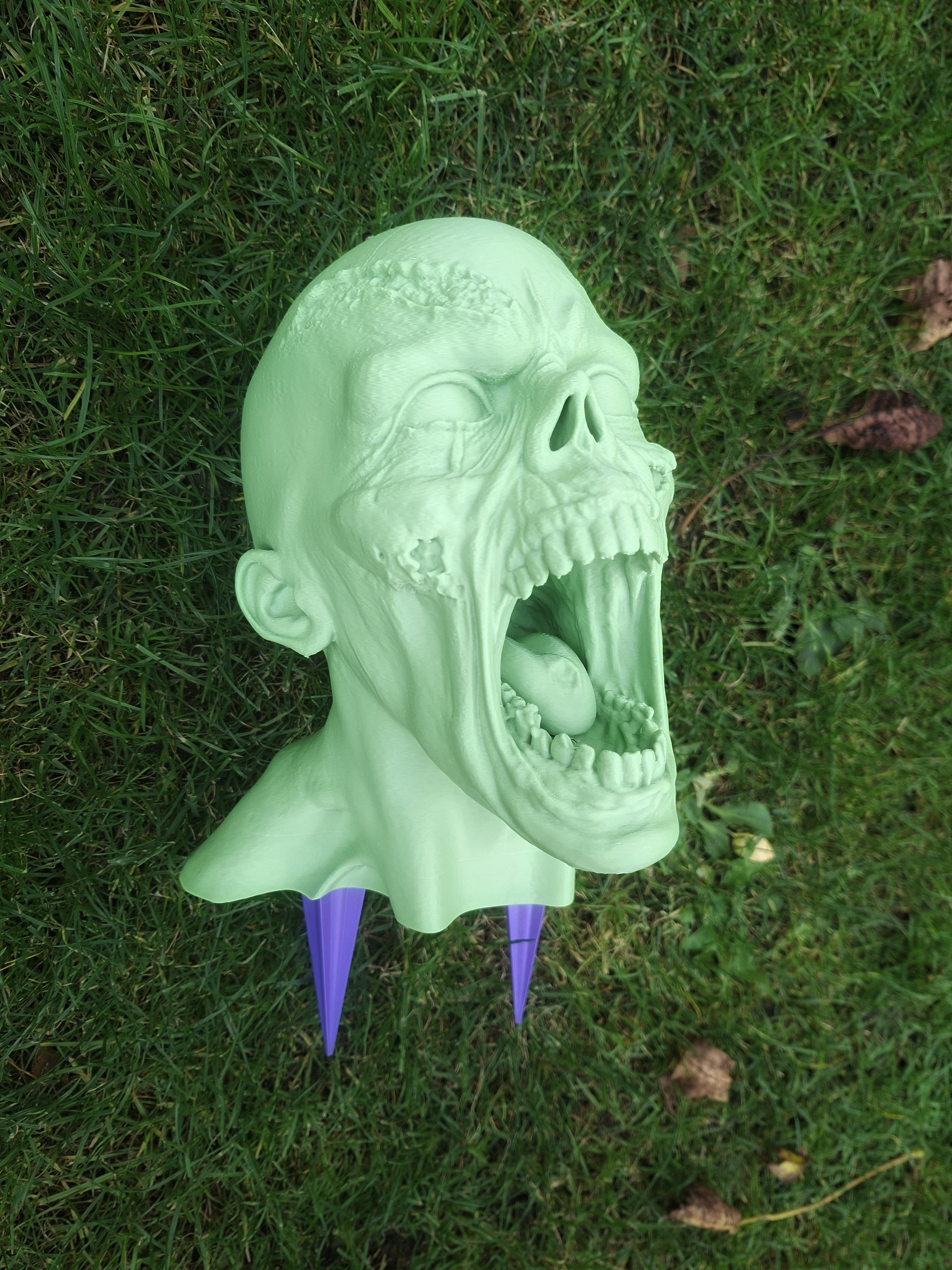 Halloween garden decoration in the form of a zombie head. The model also includes a spike for sticking into the ground.