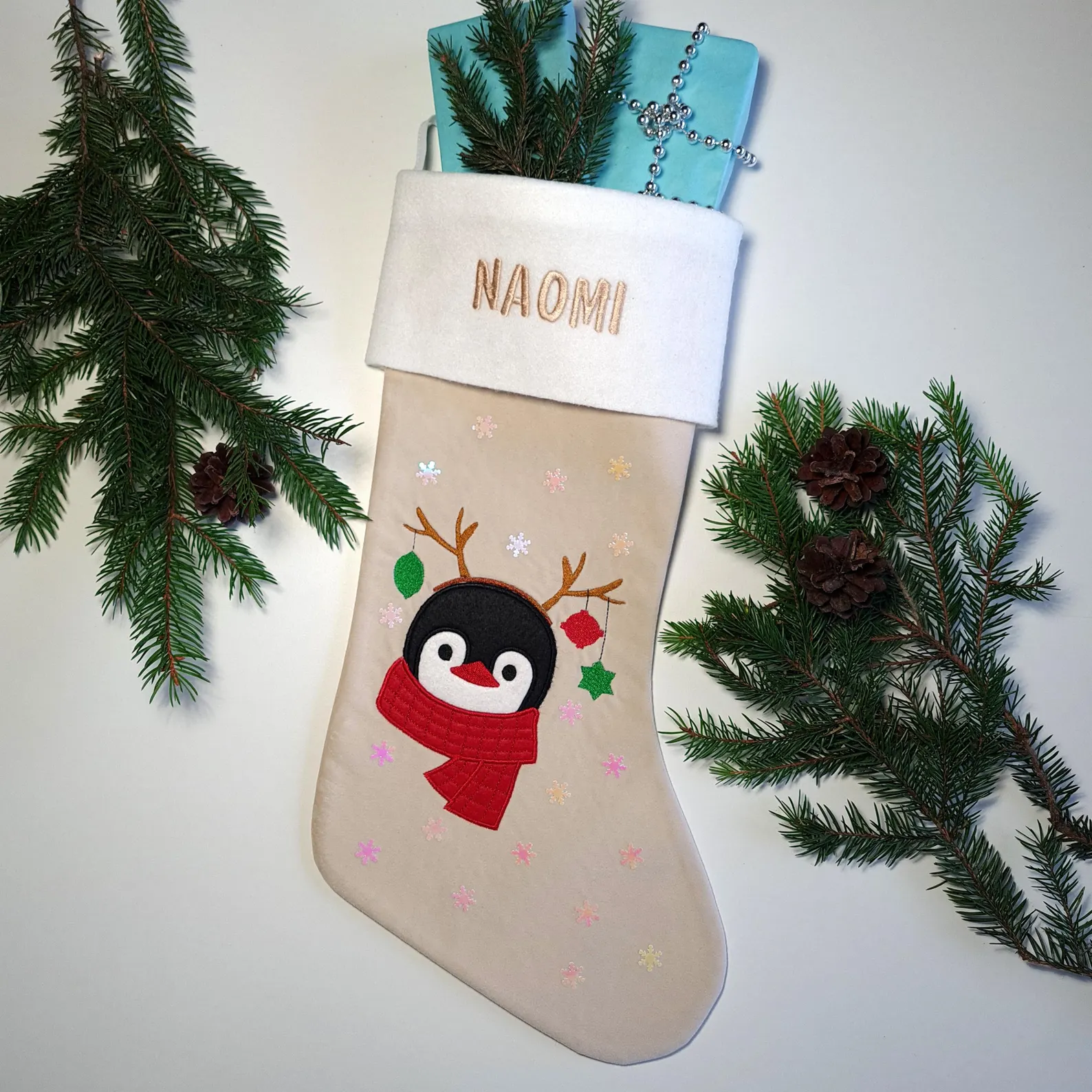 A beige velour Christmas sock with a white felt cuff embroidered in matching dark beige. Features a cheerful penguin with antlers decorated by colorful baubles and a red scarf. Whimsical, playful, and ideal for children’s rooms or your first Christmas celebration.