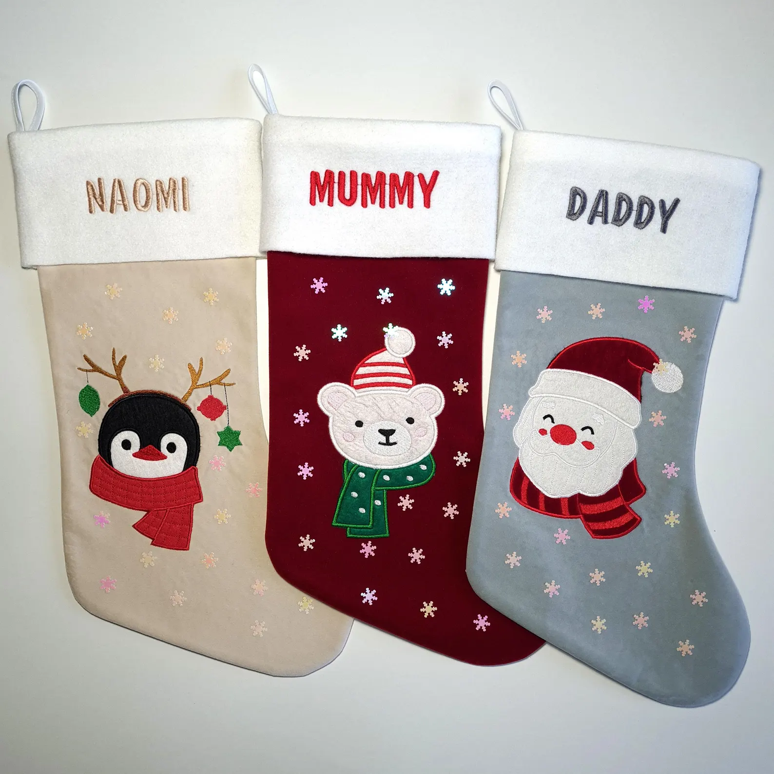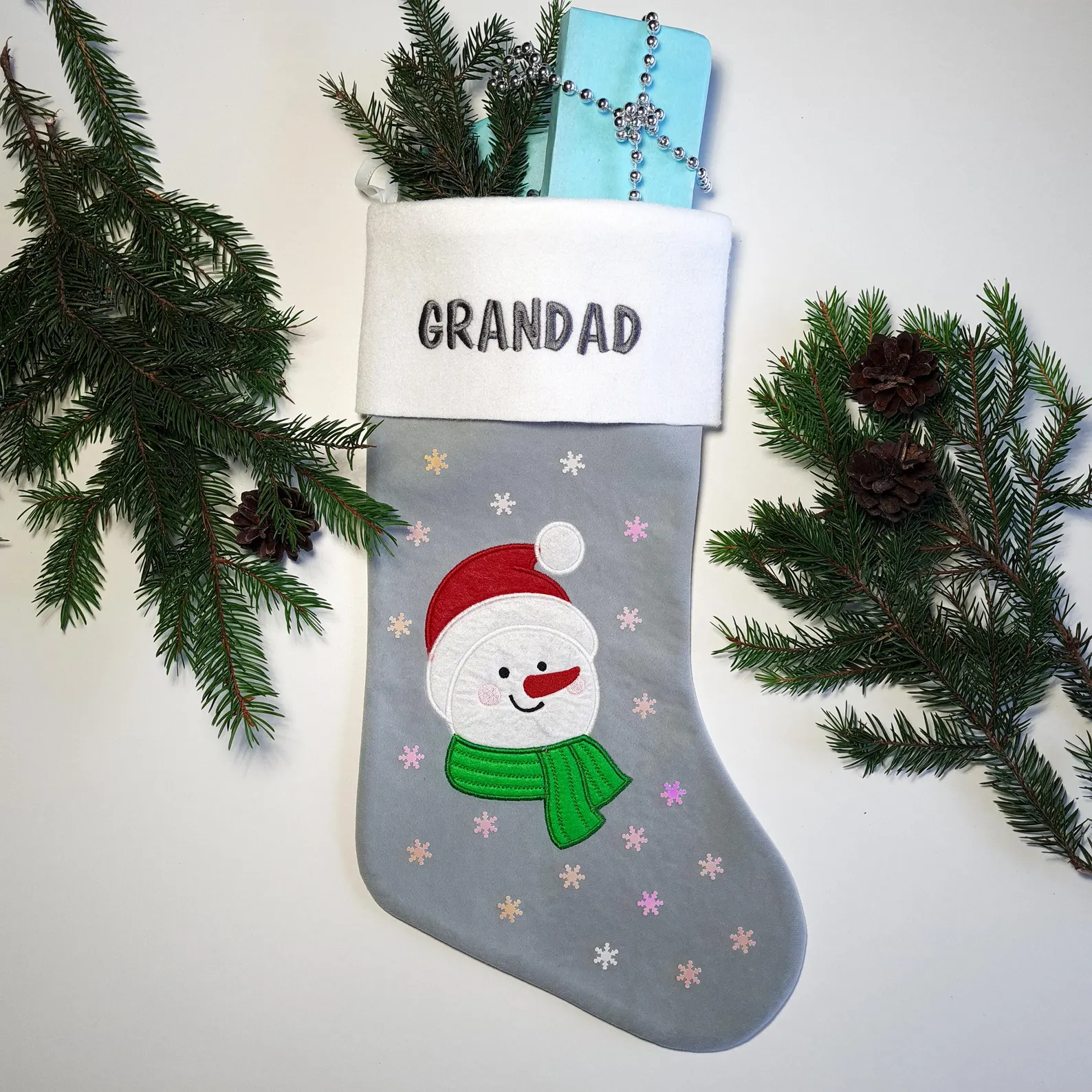 A joyful grey velour stocking featuring a bright snowman in a red hat and green scarf. The cuff is embroidered with your chosen name, and snowflake details add festive sparkle. A wonderful personalized stocking for families who love classic winter themes.