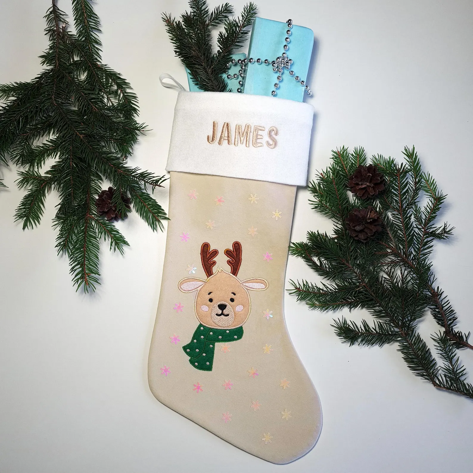 A cozy beige velour custom stocking with a friendly reindeer face, brown antlers, and a green scarf with golden dots. Glittering snowflakes complete the look – the perfect family stocking for rustic or Scandinavian Christmas themes.