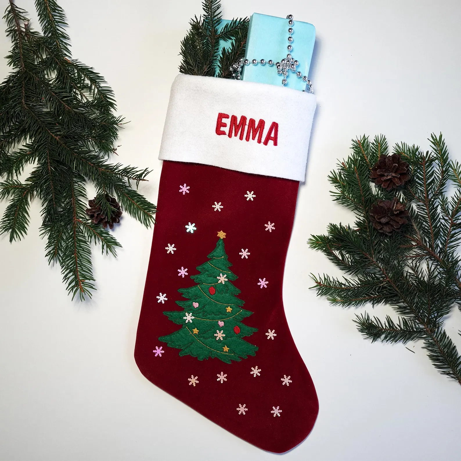 Celebrate timeless charm with this dark red velour stocking featuring a detailed green Christmas tree with baubles, garlands, and a shining star. The cuff, embroidered with your name, adds a personal touch to your Christmas decor.