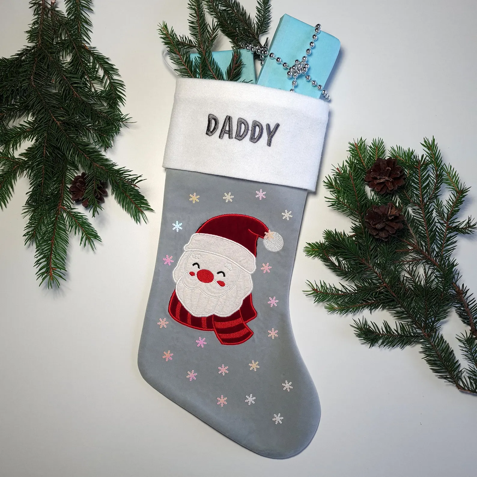 A classic Father Christmas stocking made from soft grey velour with a white felt cuff embroidered in grey thread. Santa’s smiling face, fluffy beard, and bright red hat bring festive warmth to your home. Glittering snowflakes reflect the lights of your Christmas tree – the perfect custom stocking for traditional décor.