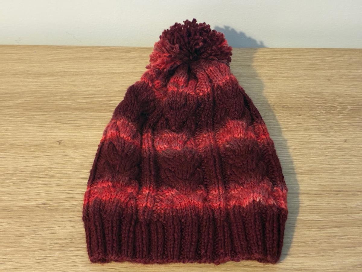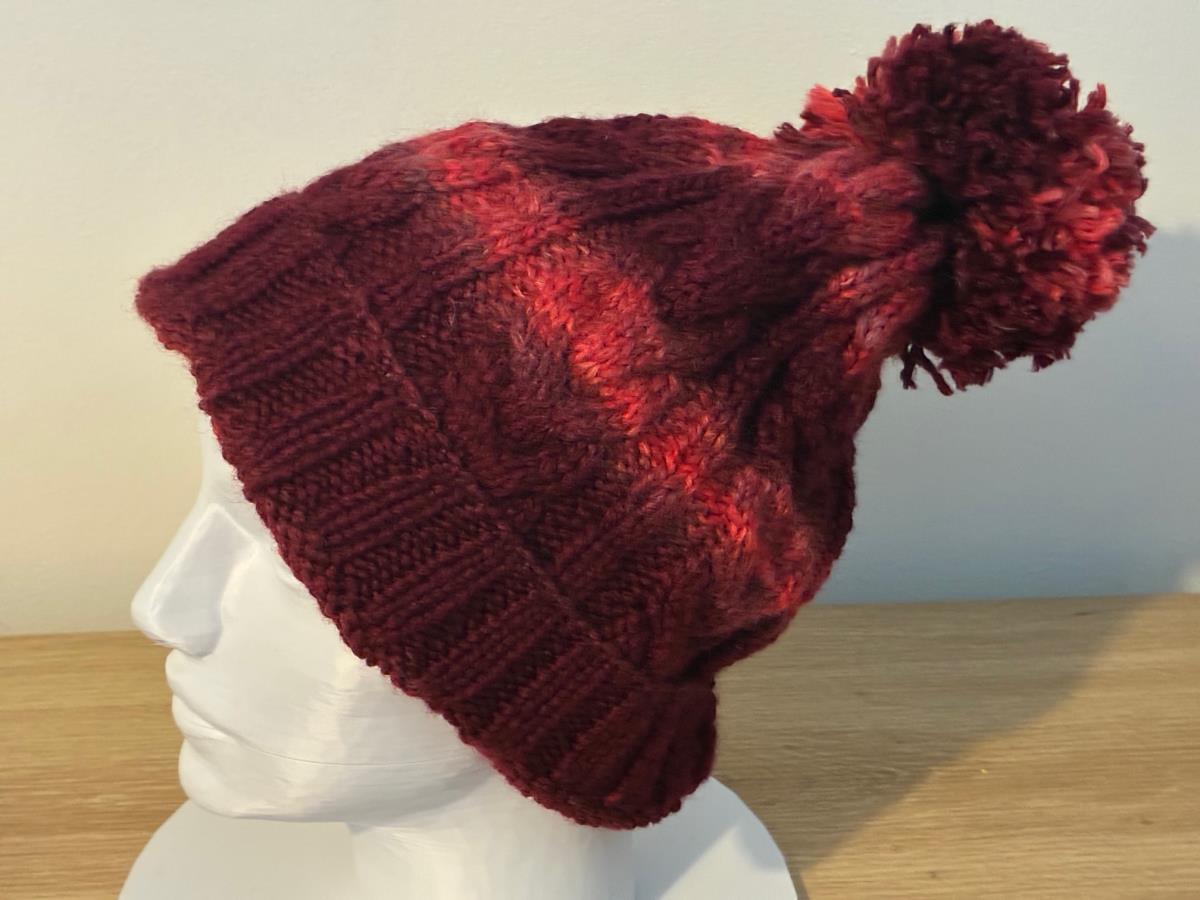 This beautiful burgundy beanie features a classic cable knit pattern and a soft pom pom on top, making it both timeless and cozy.