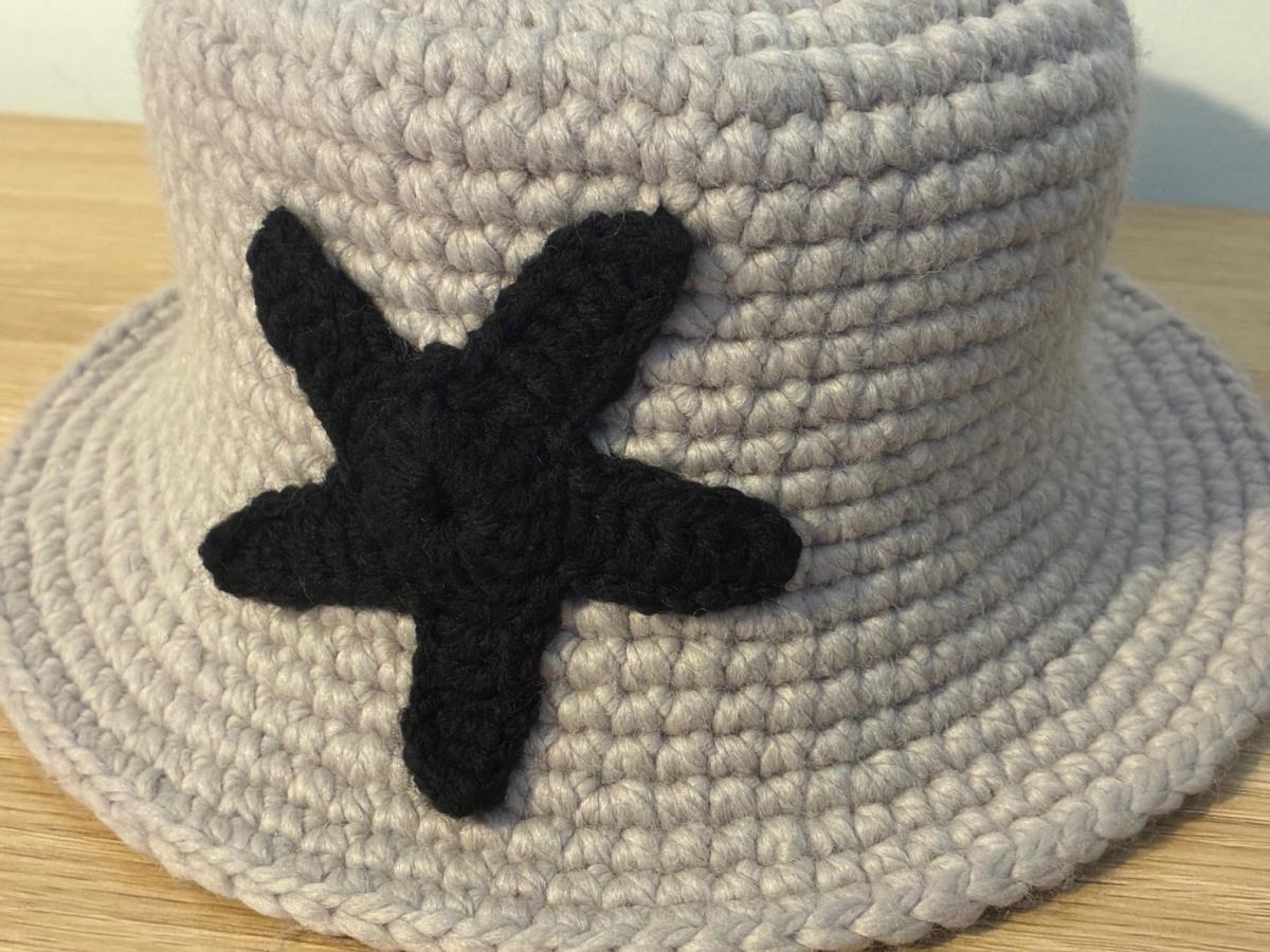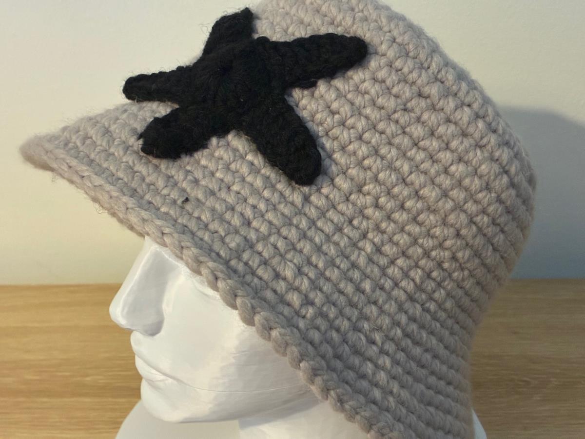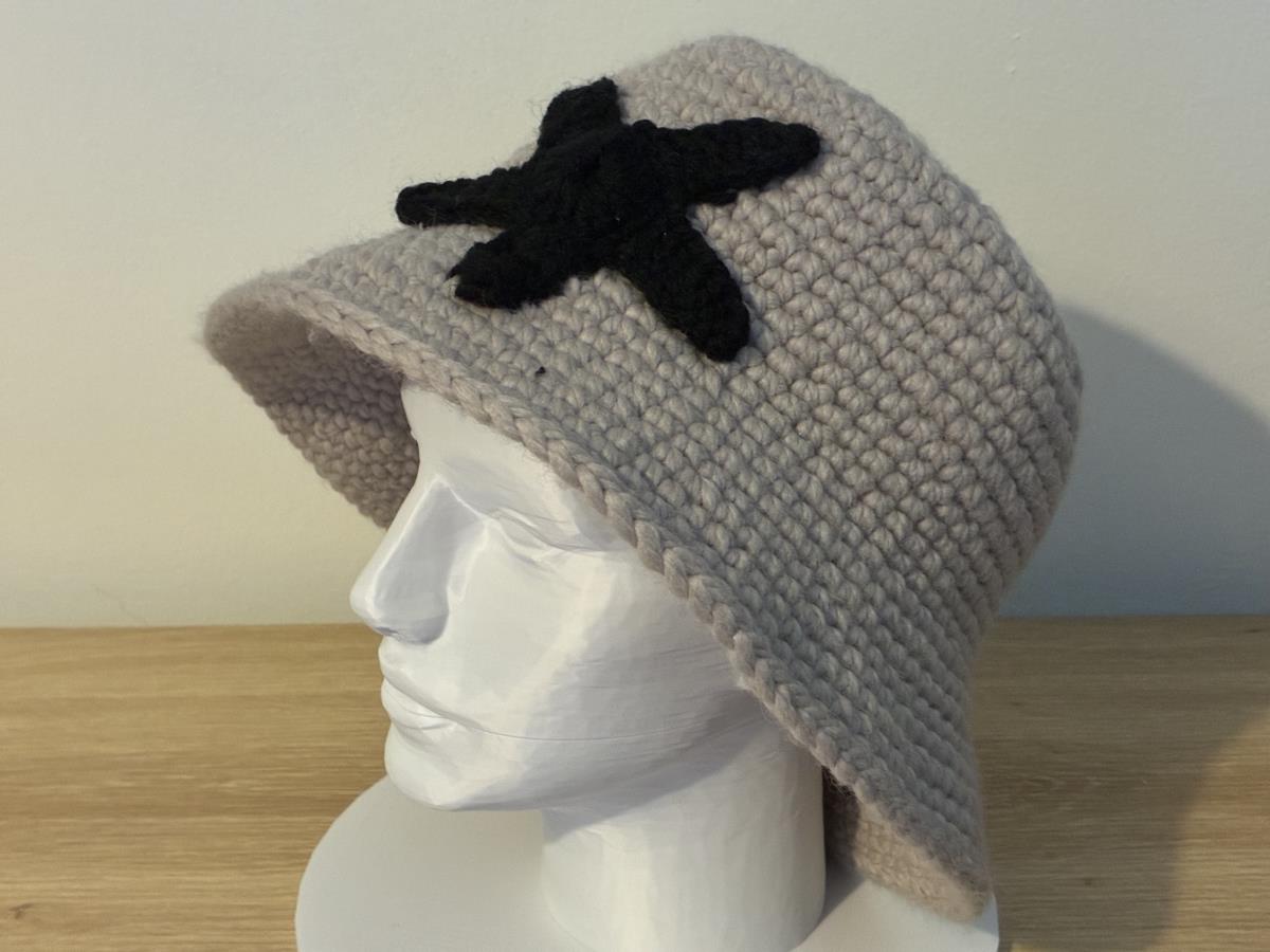 Add a unique touch to your winter wardrobe with this handmade wool bucket hat featuring a bold black star detail.
