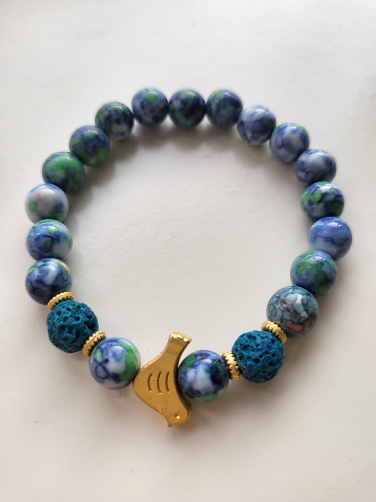 🌿 Variscite & Lava Stone Bracelet with Gold Bird Charm