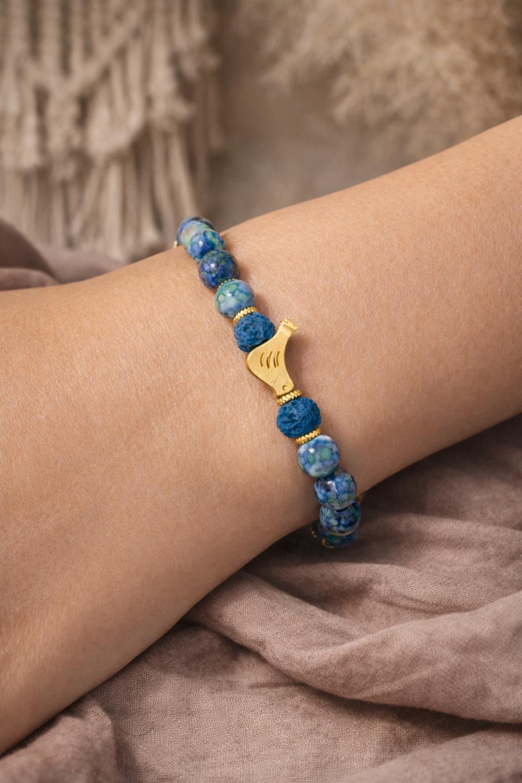 This handcrafted bracelet features genuine Variscite and lava stones, accented with a delicate gold bird charm symbolizing freedom, peace, and harmony. Designed in a boho-minimal style, it is perfect for everyday elegance or meaningful gifting.